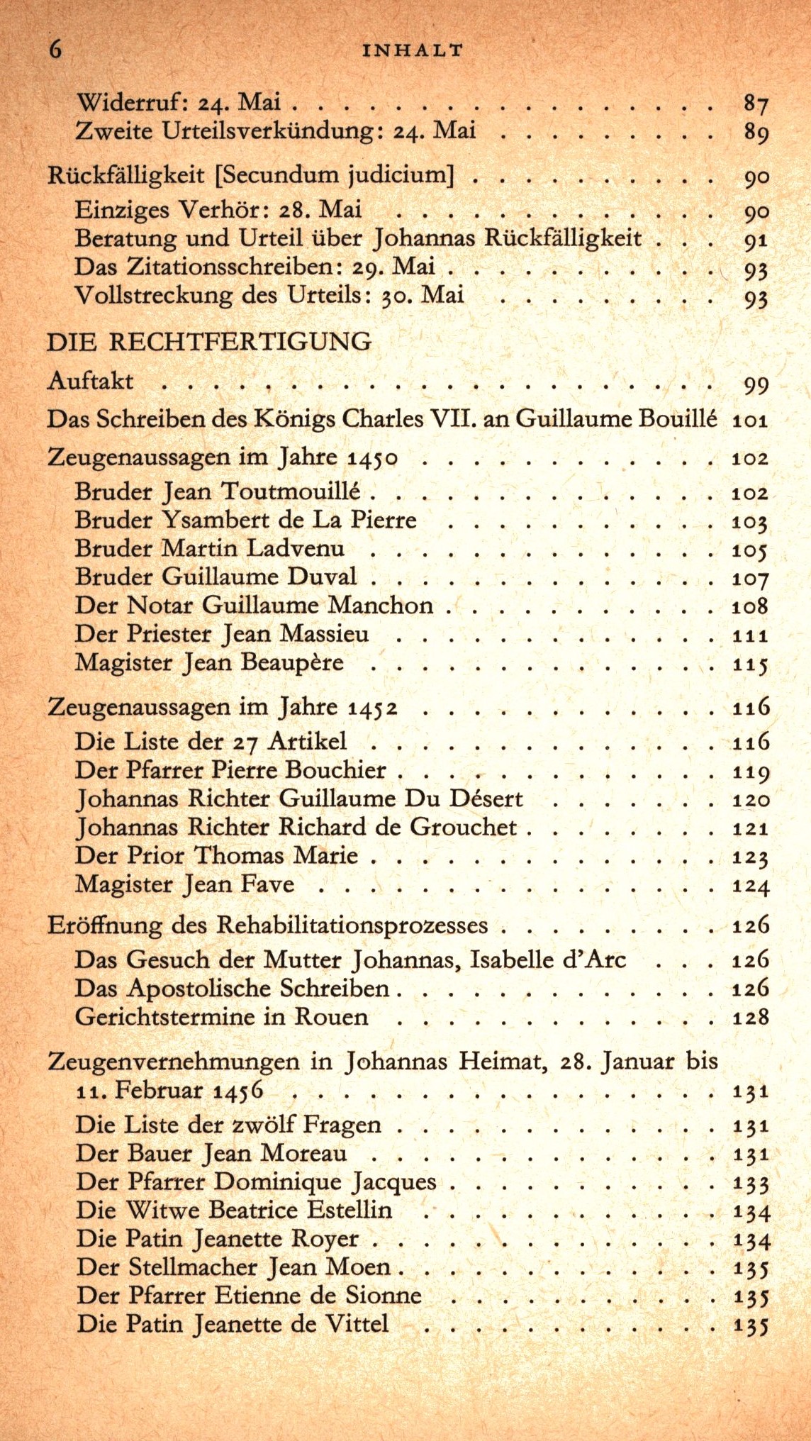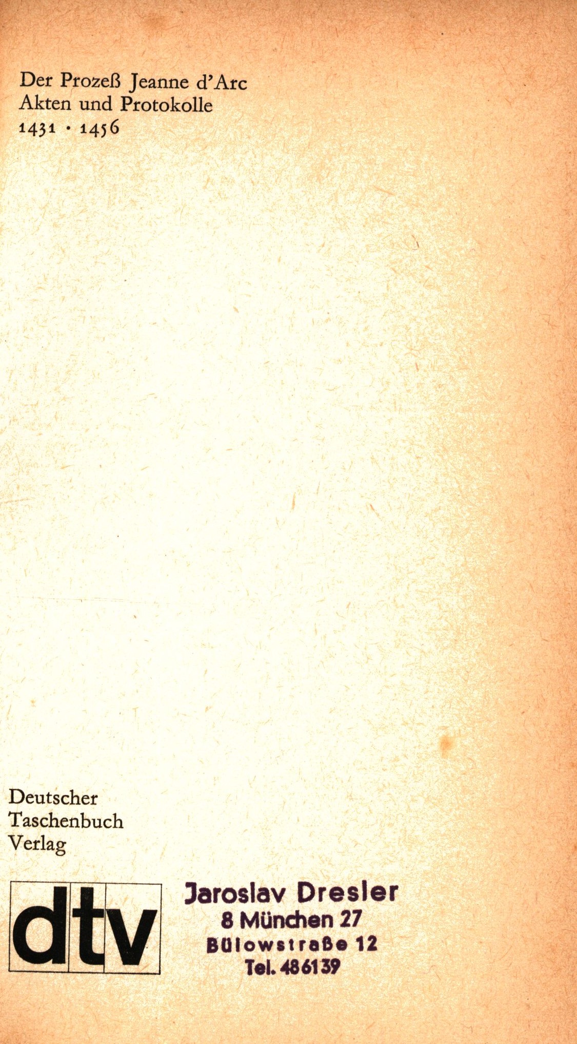 Title information Der Prozeß Jeanne d'Arc 1431 · 1456 : Akten und Protokolle / Übersetzt und herausgegeben von Ruth Schirmer-Imhoff ; Ausstattung: Celestino Piatti Personal name Schirmer-Imhoff, Ruth (Translator) (Adapter) Další autoři Piatti, Celestino (Book designer) Corporation Deutscher Taschenbuch Verlag (nakladatelství) (Publisher) Publication [München] : Deutscher Taschenbuch Verlag, [1961] Scope 232 stran; 18 cm ISBN (Brožováno) Country Germany Language German Note Zdobená obálka. - Závěr. - Poznámky