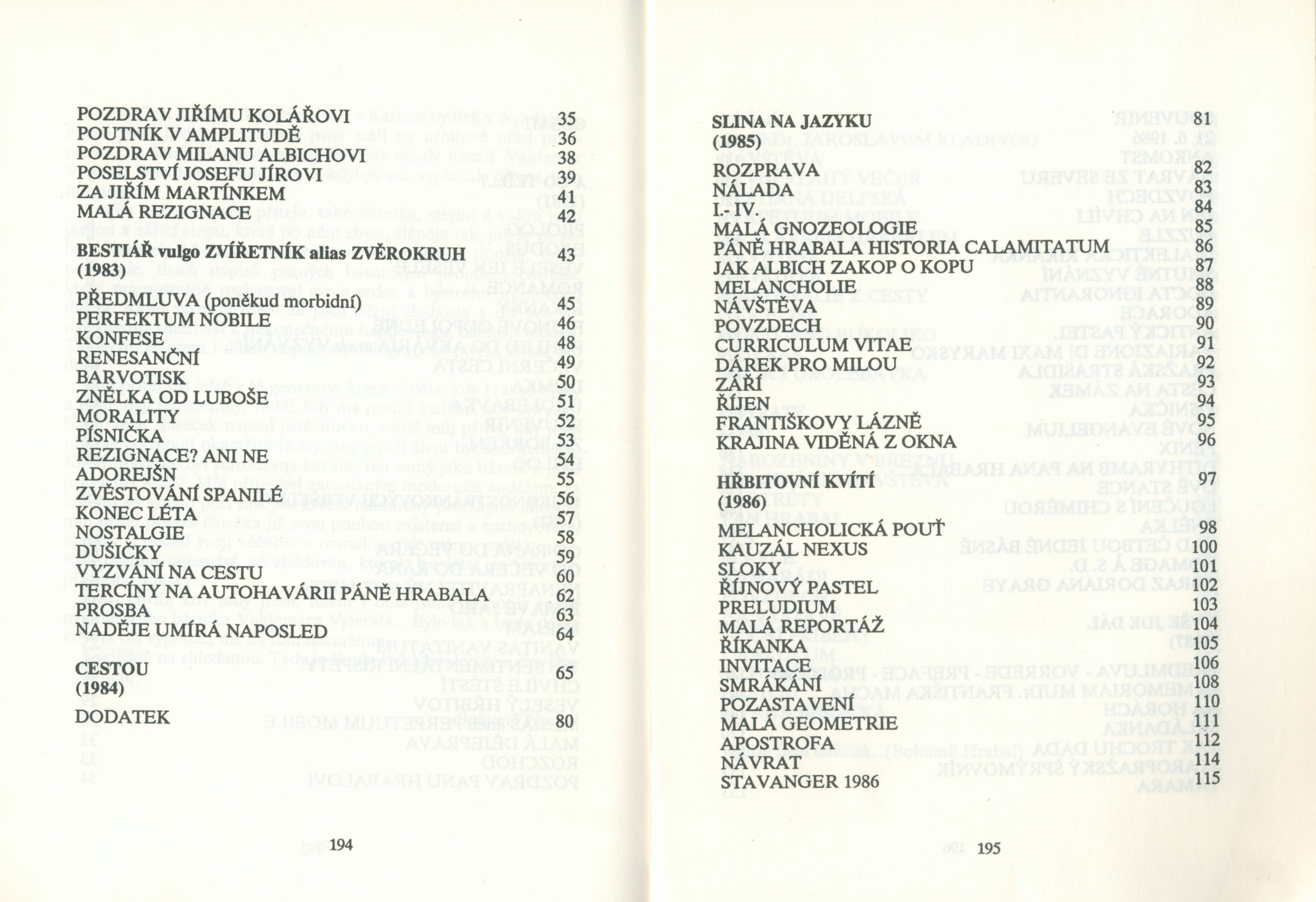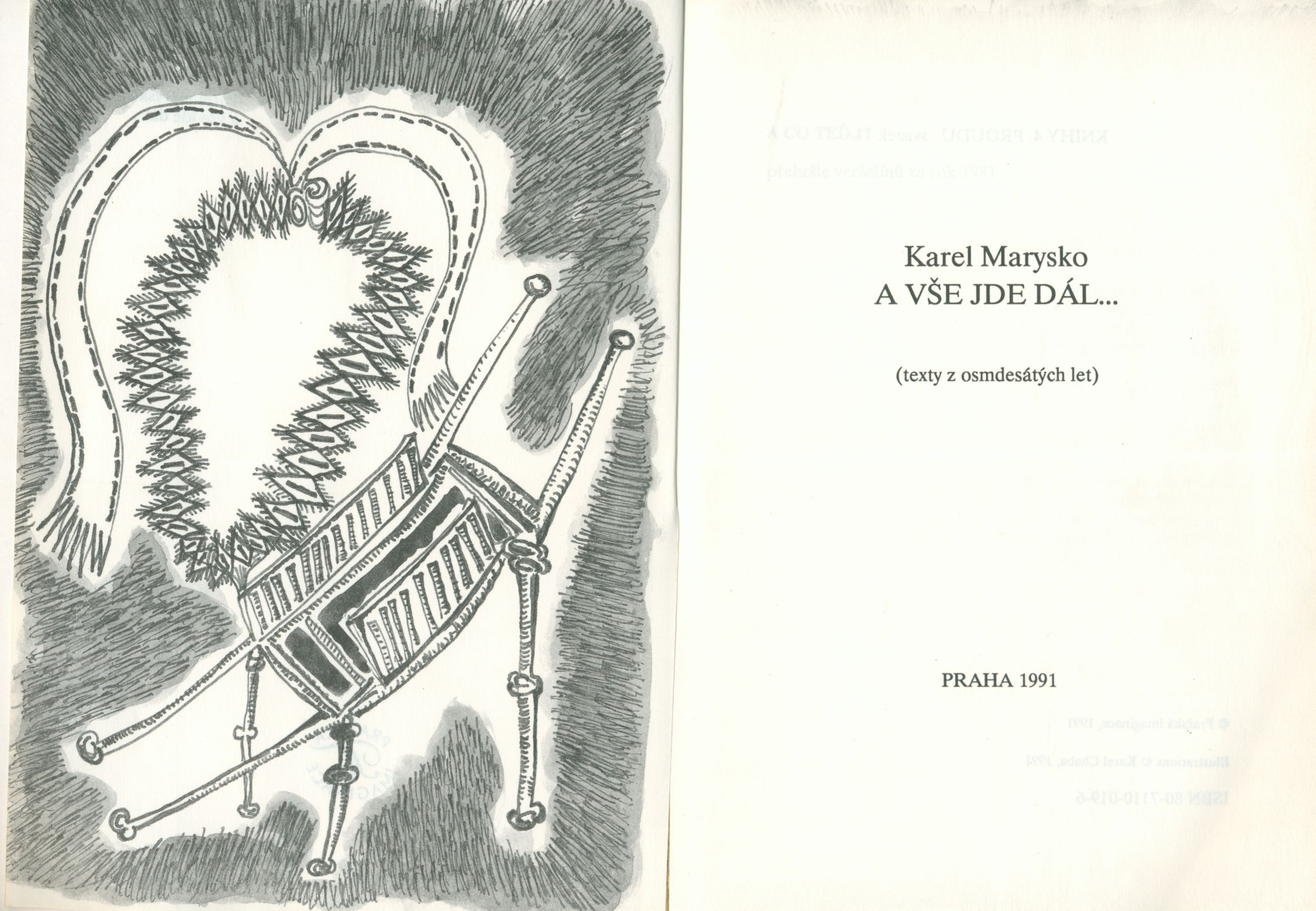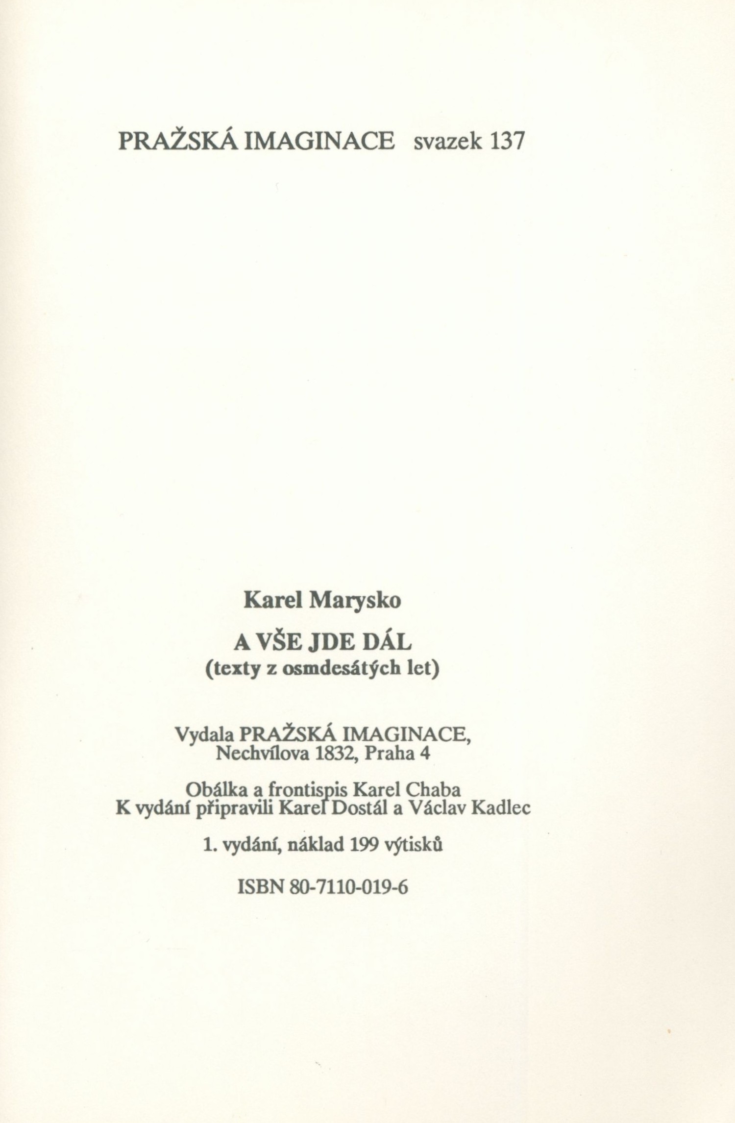Knihy 4. proudu (Pražská imaginace) Pražská imaginace (Pražská imaginace)Country Czech Republic Language Czech Note Obálka s barevnou ilustrací, bílý text (na hřbetě černý). - Patitul s nakladatelskou značkou. - Frontispis (černobílá ilustrace). - Básně. - Doslov B. Hrabal. - Obsah. - Na zadní straně informace o dílech autora vydaných Pražskou imaginací. - Přebal.