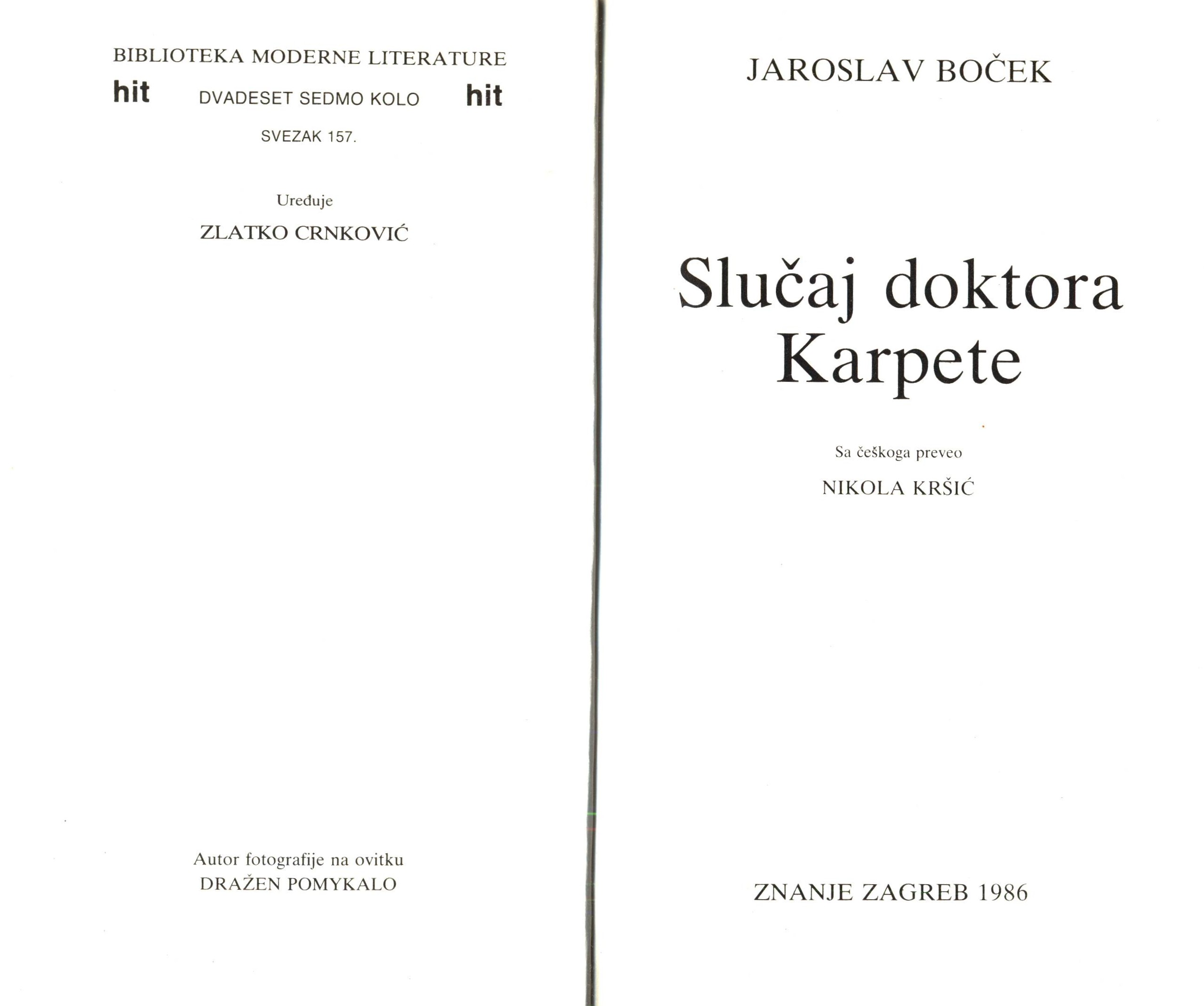 Hit. Biblioteka moderne literature, (Znanje)Country Croatia Language Croatian Language of the original Czech Note Název originálu: Případ doktora Karpety