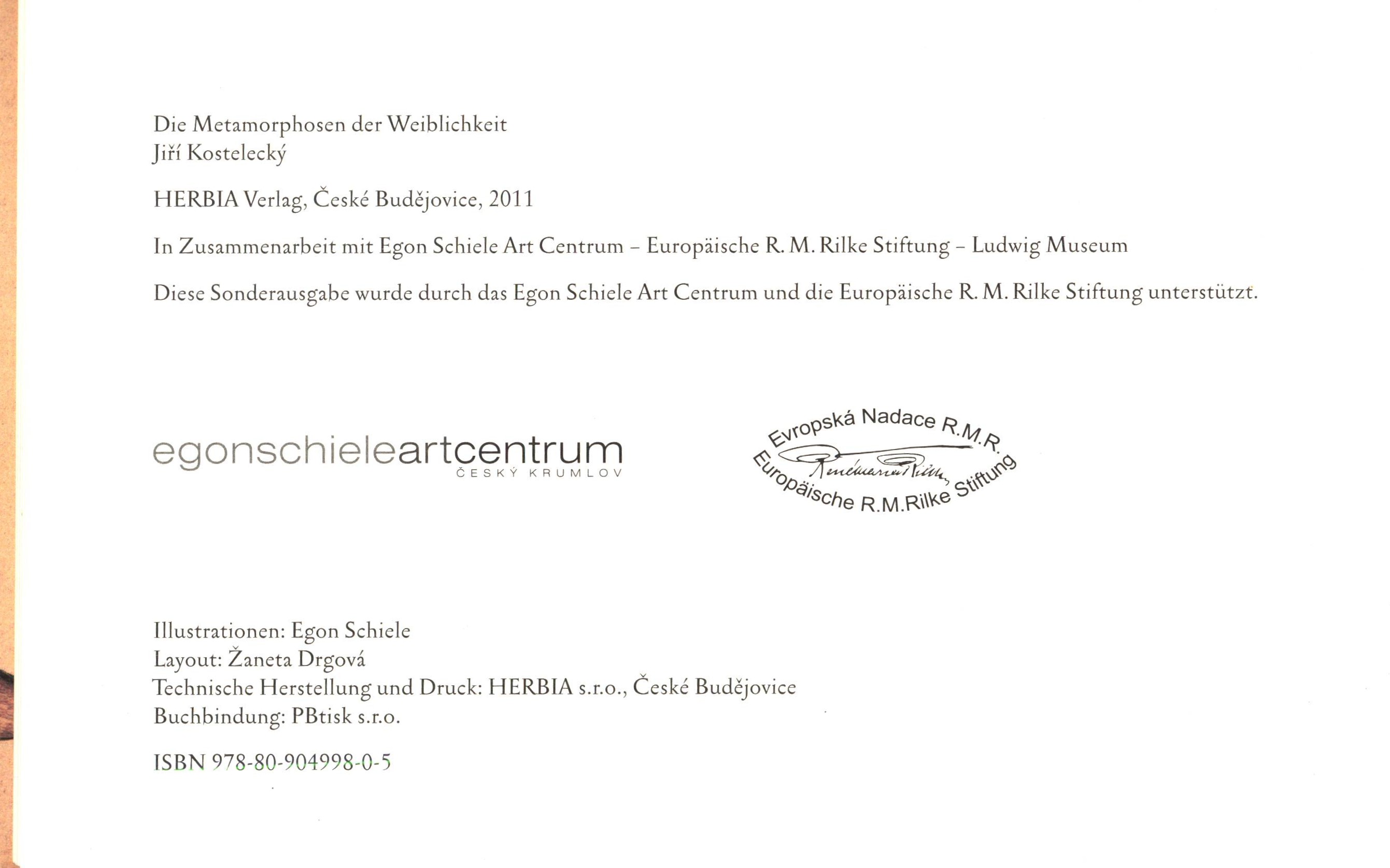 Title information Die Metamorphosen der Weiblichkeit / Jiří Kostelecký ; Illustrationen Egon Schiele Personal name Kostelecký, Jiří, 1946- (Author) Další autoři Schiele, Egon, 1890-1918 (Illustrator) Corporation Herbia, s.r.o. (tiskárna) (Publisher) (Printer) Publication České Budějovice : Herbia Verlag, 2011 Manufacture Technische Herstellung und Druck: Herbia s.r.o. Scope 51 stran : ilustrace (převážně barevné) ; 16 x 25 cm ISBN 978-80-904998-0-5 (Herbia ; vázáno) Country Czech Republic Language German Note Vydáno ve spolupráci s Egon Schiele Art Centrum - Europäische R.M. Rilke Stiftung - Ludwig Museum