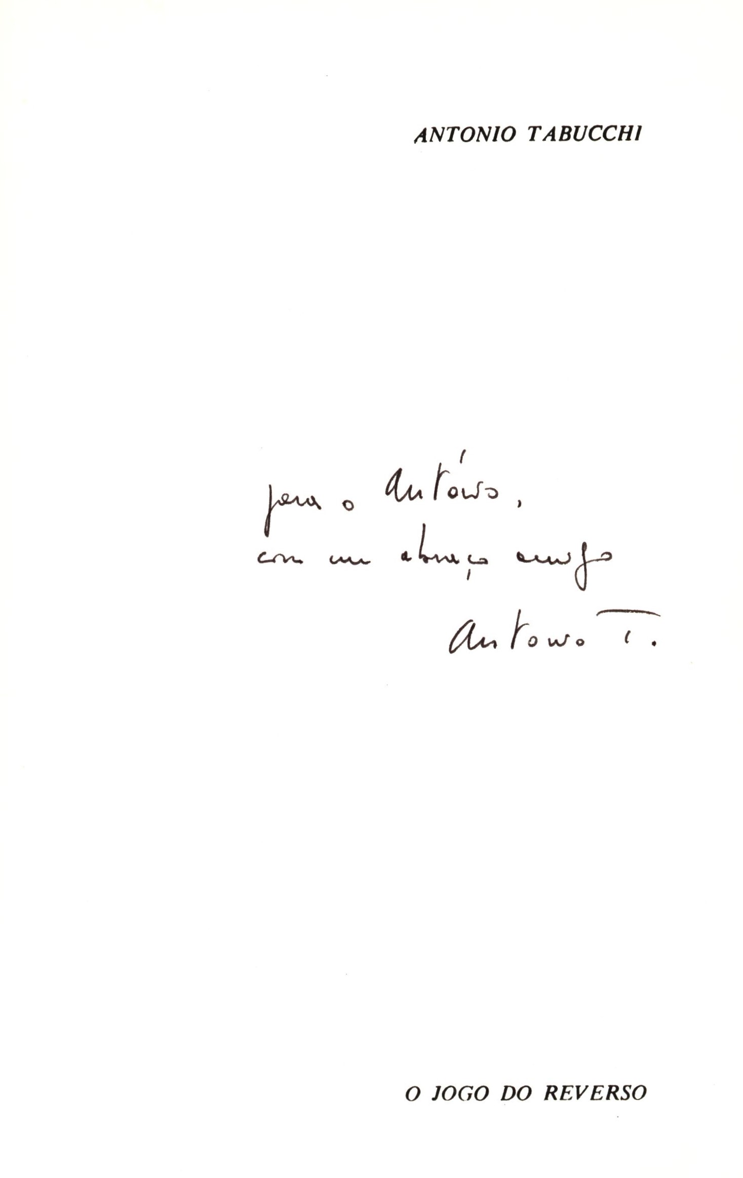Title information O jogo do reverso / Antonio Tabucchi ; prefácio de José Cardoso Pires Personal name Tabucchi, Antonio (Author) Další autoři Pires, José Cardoso, 1925-1998 (win) Corporation Vega (Publisher) Edition statement 1.a edição Publication [Lisboa] : Vega, [1984] Scope 130 stran : čb ilustrace ; 21 cm ISBN (Brožováno) Edition Provisórios & Definitivos (Vega)