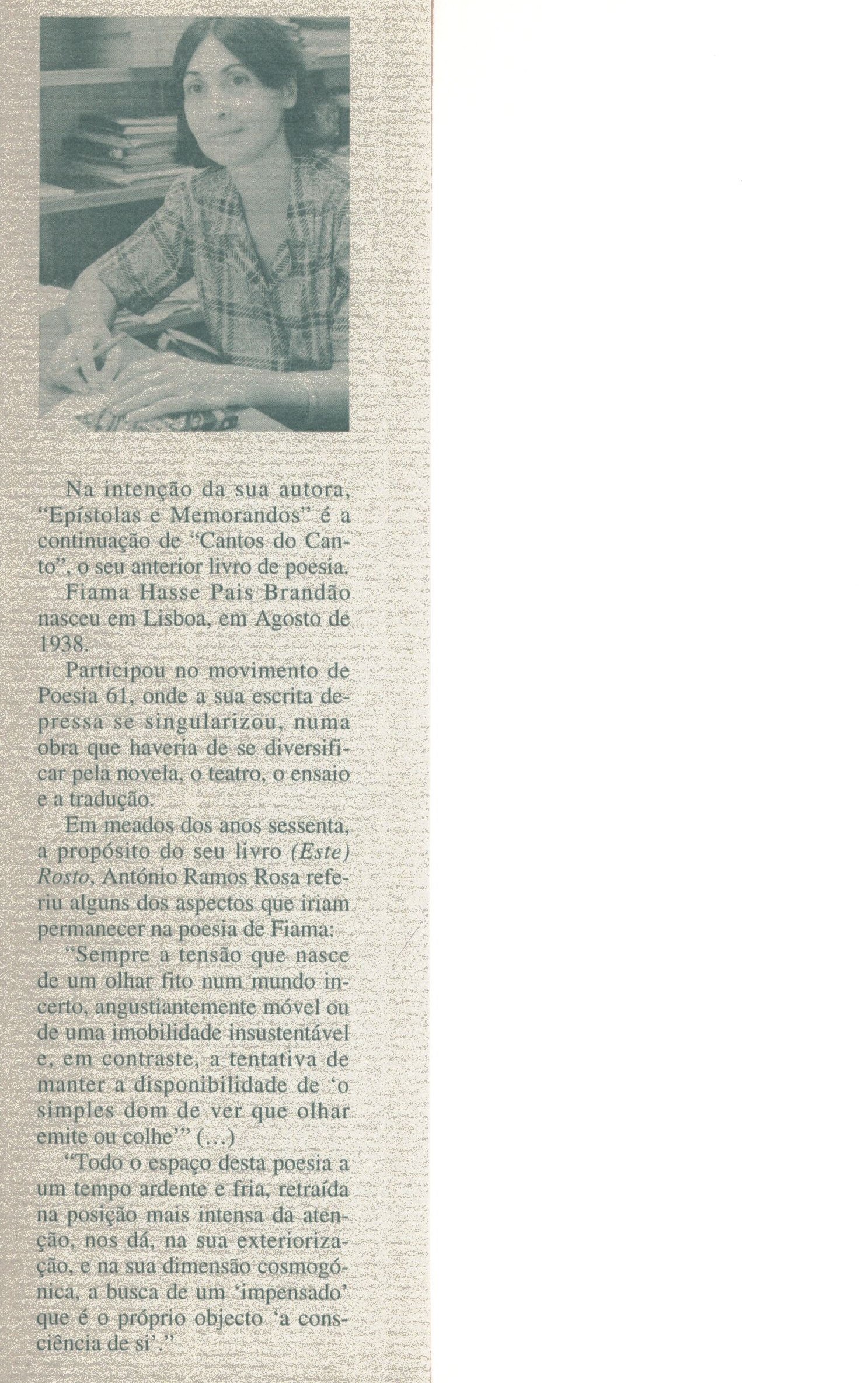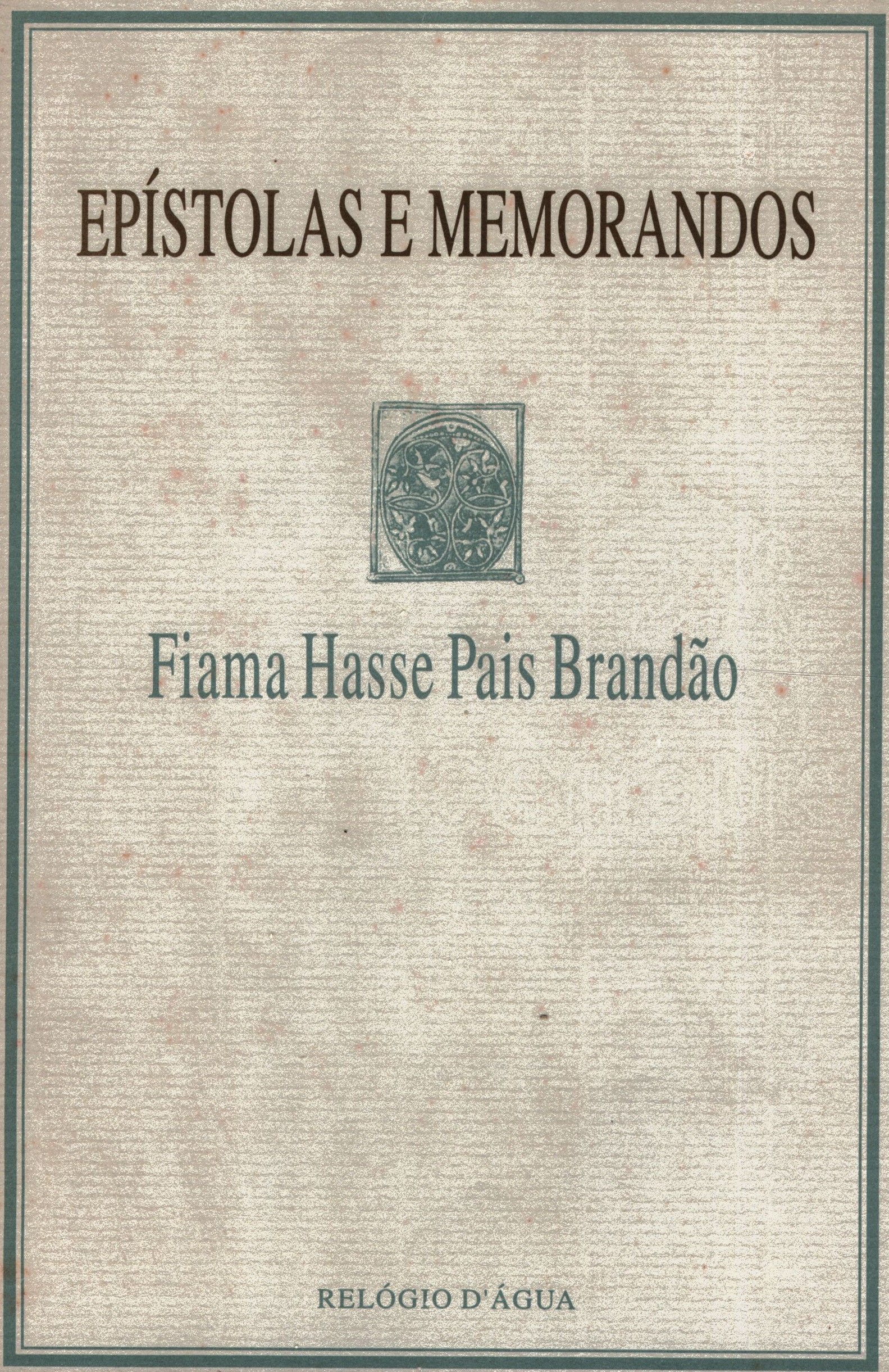 Title information Epístolas e memorandos / Fiama Hasse Pais Brandão Personal name Brandão, Fiama Hasse Pais, 1938-2007 (Author) Další autoři Relógio d’Agua (nakladatelství) (Publisher) Arco-Íris, Artes Gráficas, Lda. (Printer) Publication [Lisboa] : Relógio d’Agua, [1996] Manufacture Arco-Íris, Artes Gráficas, Lda. Copyright notice date ©1996 Scope 40 stran : ilustrace ; 21 cm ISBN 972-708-310-2 (brožováno) Country Portugal Language Portuguese Note Zdobená obálka. - Ilustrace