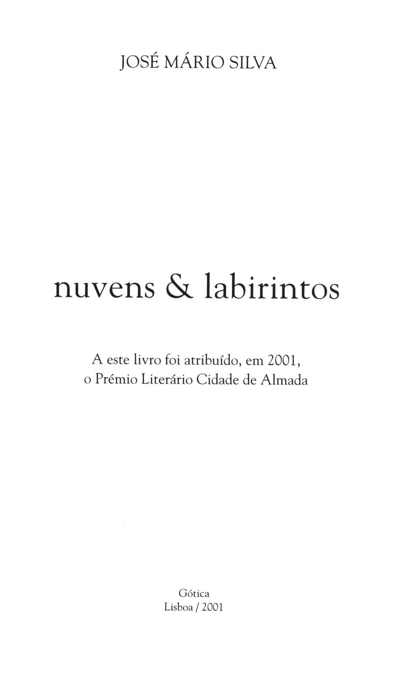 Title information Nuvens e labirintos / José Mário Silva Personal name Silva, José Mário (Author) Další autoři Gótica (firma) (Publisher) Tipografia Guerra (Printer) Publication Lisboa : Gótica, 2001 Manufacture [Viseu] : Tipografia Guerra Scope 81 stran ; 21 cm ISBN 972-792-033-0 (vázáno) Country Portugal Language Portuguese Note Zdobená obálka