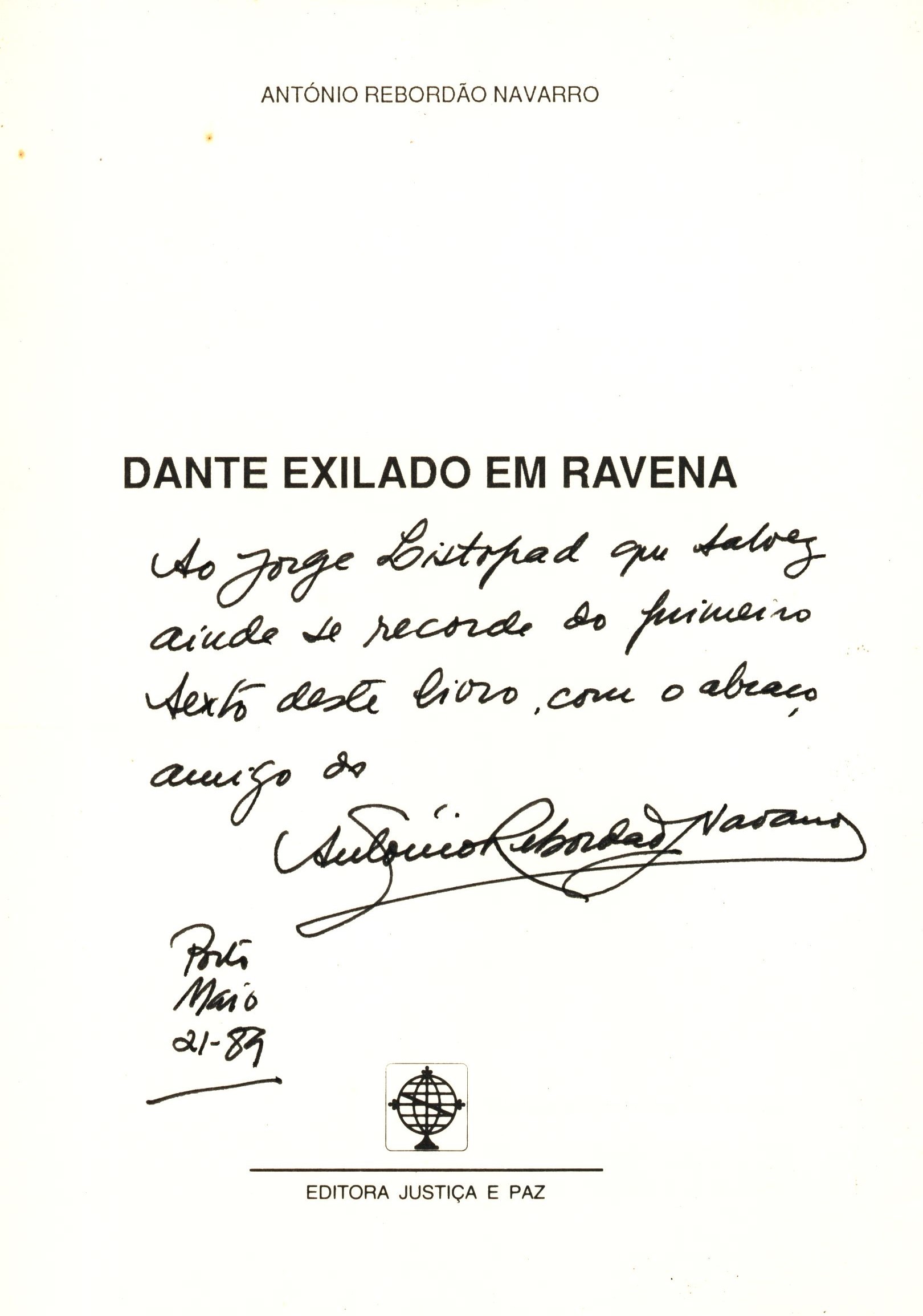 Title information Dante exilado em Ravena / Personal name Navarro, António Rebordão, 1933-2015 (Author) Další autoři Editora Justiça e paz (Publisher) Papelmunde (Printer) Edition statement 1a edição Publication [V. N. Gaia] : Editora Justiça e paz, [1989] Manufacture Papelmunde Scope 85 stran ; 21 cm ISBN 972-583-029-6 (vázáno) Edition Colecção do Desassossego (Editora Justiça e paz) ; 7