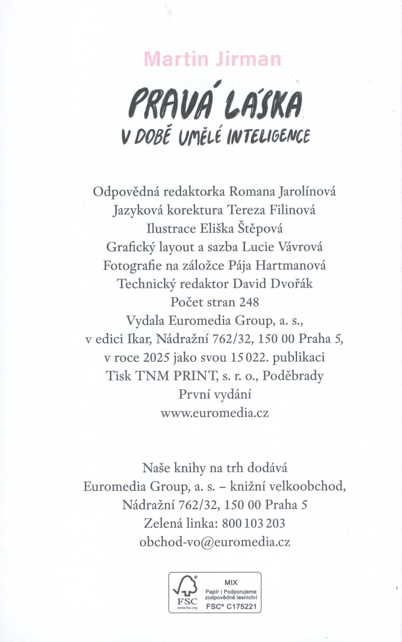 Title information Pravá láska v době umělé inteligence / Martin Jirman ; ilustrace Eliška Štěpová ; grafický layout a sazba Lucie Vávrová Personal name Jirman, Martin, 1987- (Author) Další autoři Štěpová, Eliška, 1993- (Illustrator) Vávrová, Lucie, 1992- (Book designer) (Compositor) Corporation Euromedia Group, a.s. - Ikar (nakladatelství) (Publisher) TNM PRINT s. r. o. (tiskárna) (Printer) Edition statement První vydání Publication Praha : Ikar, 2025 Manufacture Poděbrady : TNM PRINT, s.r.o. Scope 244 stran : barevné ilustrace ; 19 cm ISBN 978-80-249-5822-4 (brožováno) Country Czech Republic Language Czech Note Zdobená barevná obálka. - Na přední záložce obálky úryvek z knihy, na zadní záložce biografická poznámka o autorovi s tónovaným fotem. - Dvoubarevné ilustrace v textu. - Obsah. - Na zadní straně obálky anotace knihy a ohlasy na knihu.
