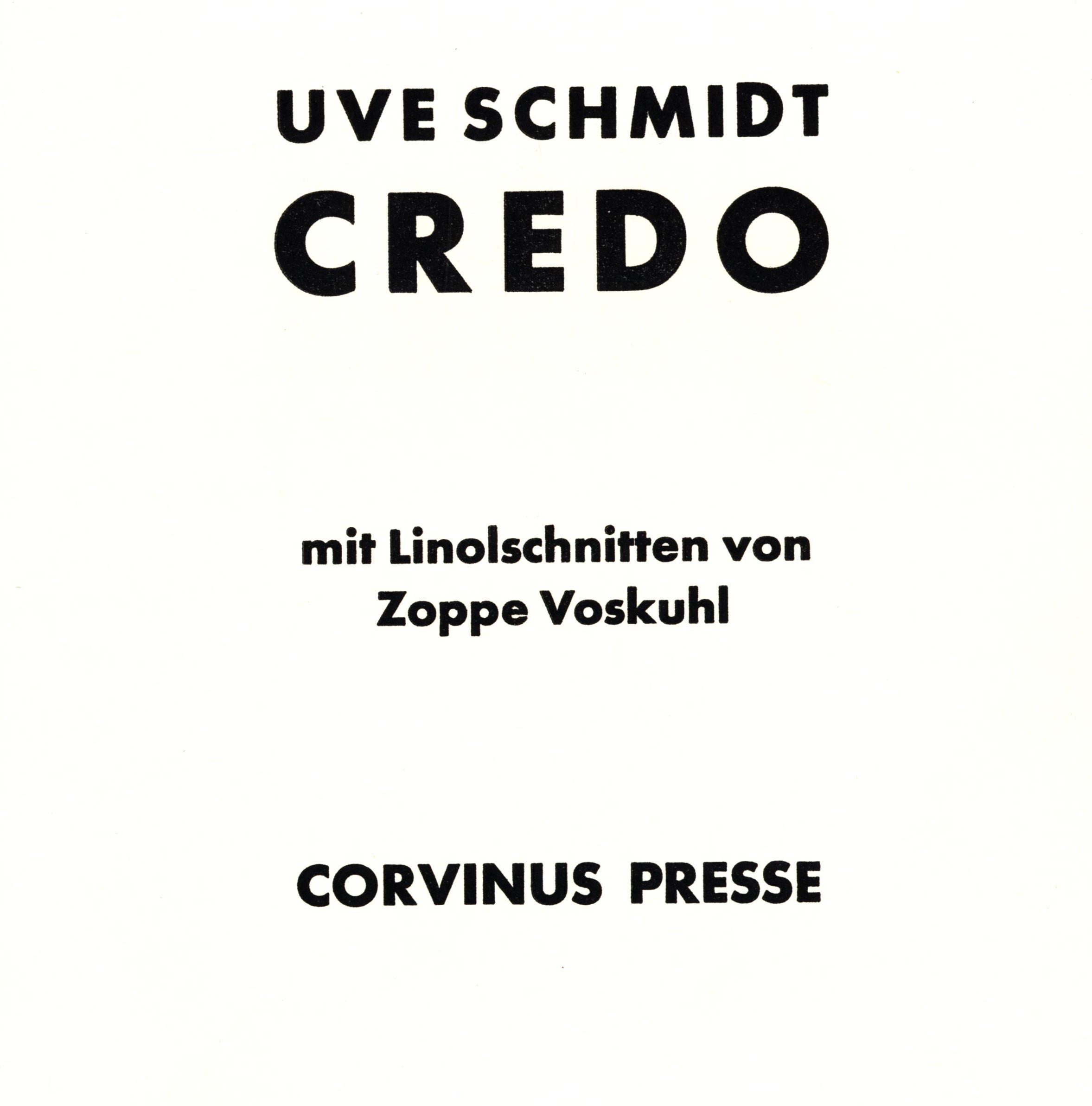 Title information Credo / Uve Schmidt ; mit Linolschnitten von Zoppe Voskuhl Personal name Schmidt, Uve (Author) Další autoři Voskuhl, Zoppe (Engraver) Liersch, Hendrik (Printer) Corporation Corvinus Presse (nakladatelství) (Publisher) Edition statement Deutsche Erstausgabe Publication [Berlin] : Corvinus Presse, [2006] Manufacture Hendrik Liersch Scope 17 nečíslovaných stran : čb. ilustrace ; 22 cm ISBN 978-3-910172-95-1 (vázáno) Country Germany Language German Note Zdobená obálka. - Ilustrovaný frontispis. - Čb. ilustrace