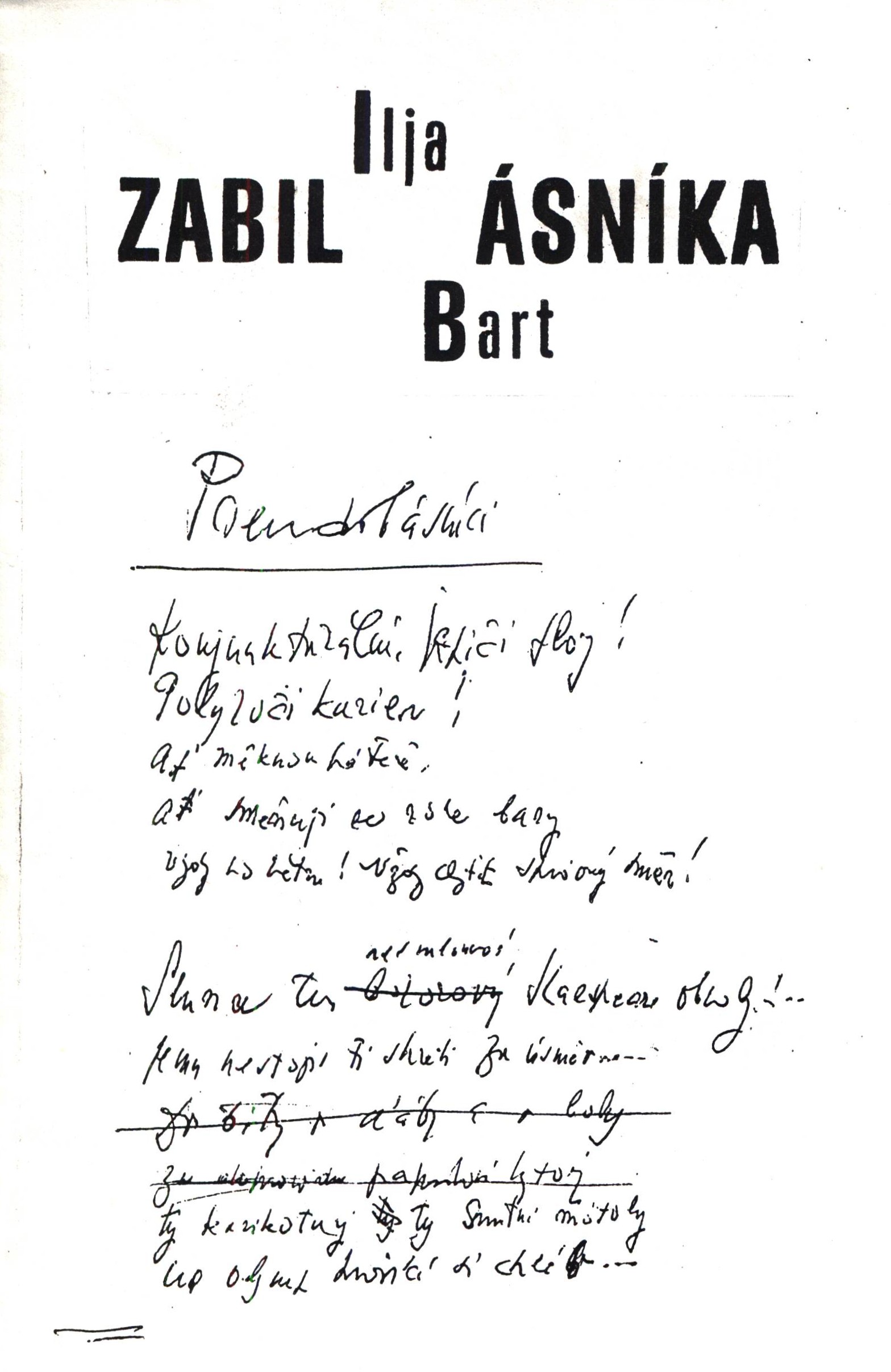 Title information Zabili básníka / Ilja Bart ; závěr Pavel Koukal Personal name Bart, Ilja, 1910-1973 (Author) Další autoři Koukal, Pavel, 1944-2014 (wac) Publication v Duchcově : [nakladatel není známý], 1993 Scope 12 nečíslovaných stran : 1 ilustrace ; 21 cm ISBN (Brožováno) Country Czech Republic Language Czech Note Vyšlo jako samizdat. - Na obálce faksimile rukopisu. - Ilustrace Bohdana Kopeckého ze sbírky Silokřivky (1970). - Závěrečný komentář o autorovi. - Vyšlo k dvacetiletému výročí úmrtí autora. - Sešitová vazba