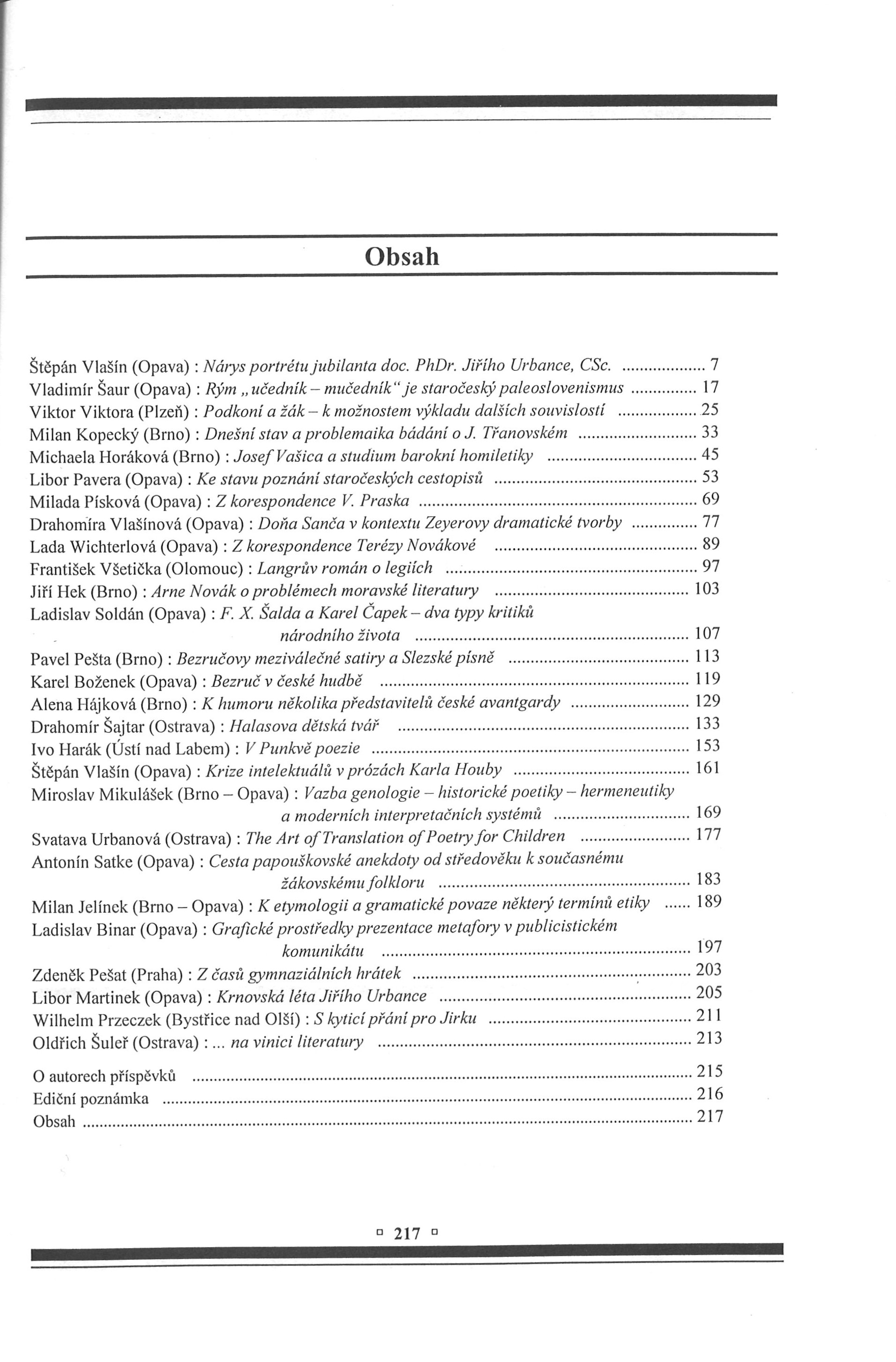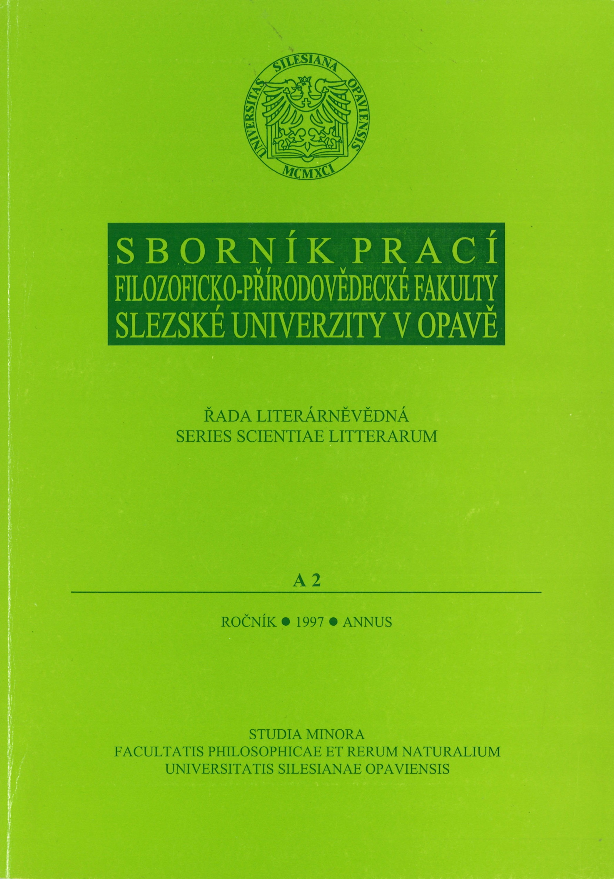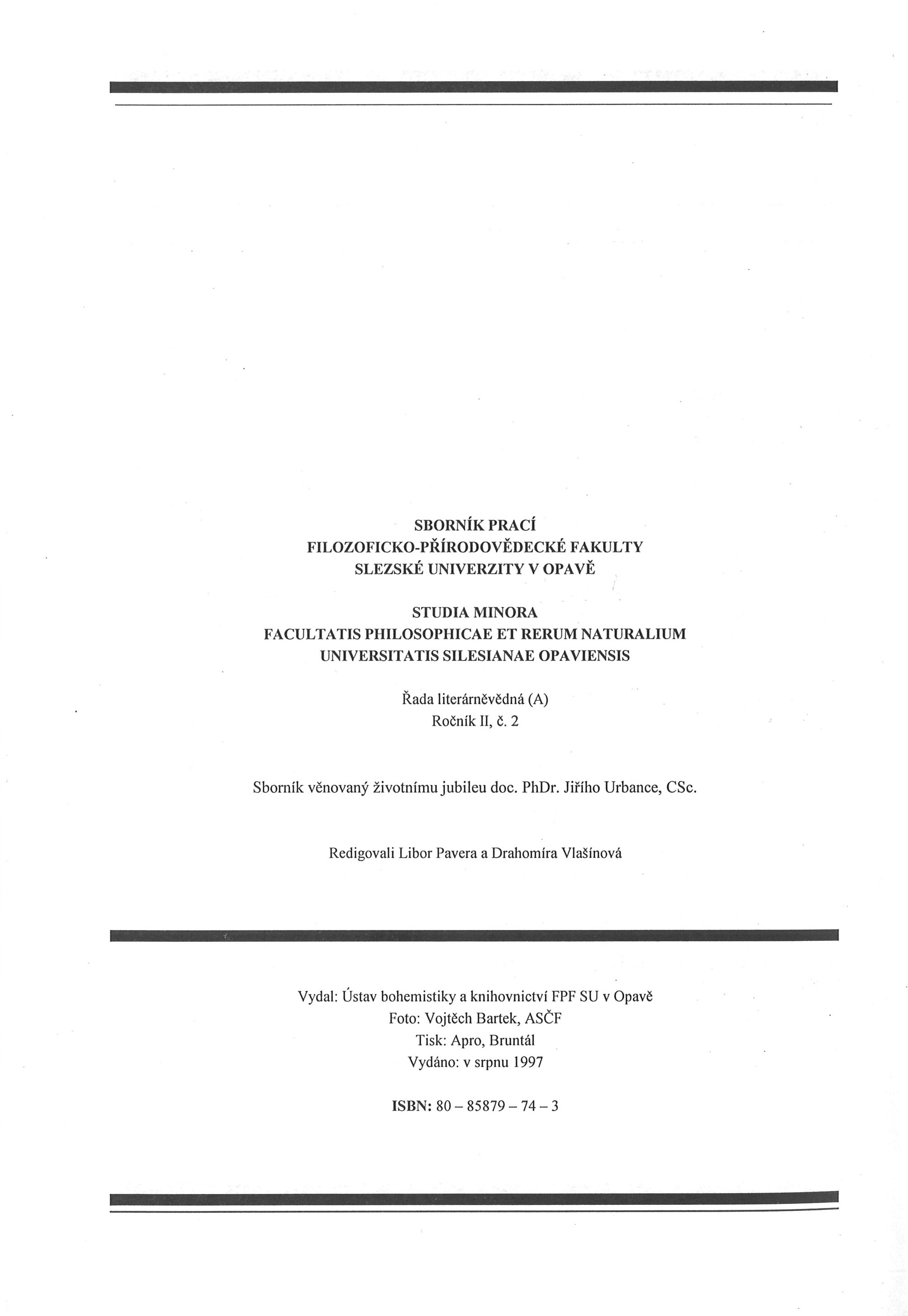 Title information Sborník prací Filozoficko-přírodovědecké fakulty Slezské univerzity v Opavě = Studia minora facultatis philosophicae et rerum naturalium Universitatis Silesianae Opaviensis. Řada literárněvědná (A). Ročník II, č. 2 / redigovali Libor Pavera a Drahomíra Vlašínová Main entry-corp. Slezská univerzita. Filozoficko-přírodovědecká fakulta. Ústav bohemistiky a knihovnictví (Publisher) Další autoři Pavera, Libor, 1972- (Editor) Vlašínová, Drahomíra, 1944- (Editor) Corporation Apro (tiskárna) (Printer) Publication Opava : Ústav bohemistiky a knihovnictví FPF SU v Opavě ; 1997 Manufacture Bruntál : Apro Scope 217 stran : 1 portrét ; 26 cm ISBN 80-85879-74-3 Country Czech Republic Language Czech * English * Latin Note "Sborník věnovaný životnímu jubileu doc. dr. Jiřího Urbance, CSc." -- Titulní list