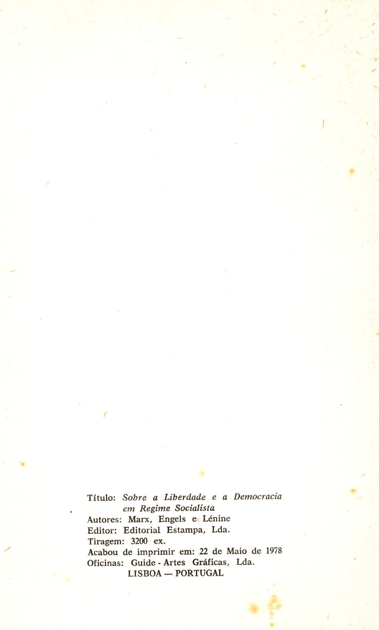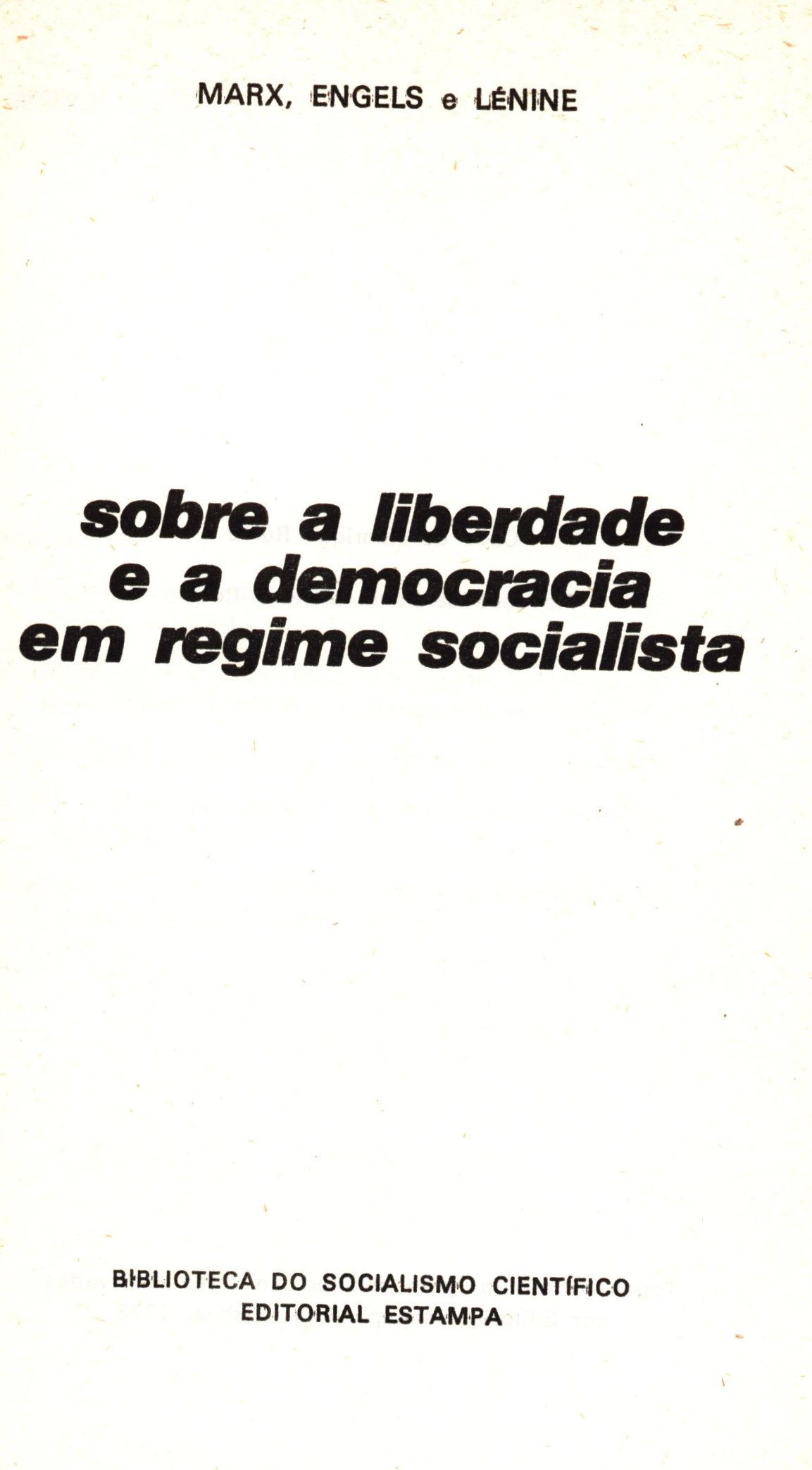 Title information Sobre a Liberdade e a Democracia em Regime Socialista / Marx, Engels e Lénine Personal name Marx, Karl, 1818-1883 (Author) Další autoři Engels, Friedrich, 1820-1895 (Author) Lenin, Vladimir Iľjič, 1870-1924 (Author) Corporation Editorial Estampa (Publisher) Guide - Artes Gráficas (Printer) Publication [Lisboa] : Editorial Estampa, [1978] Manufacture Guide - Artes Gráficas Scope 140 stran ; 19 cm ISBN (Brožováno) Edition Biblioteca do socialismo cientifico (Editorial Estampa)